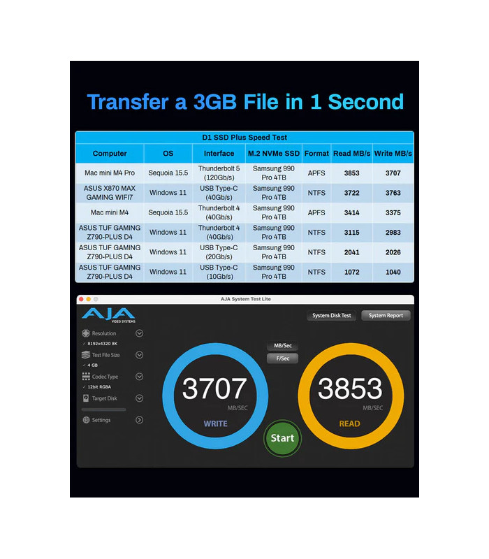 Velocità massime fino a ~3641 MB/s in lettura e ~3498 MB/s in scrittura (con SSD compatibili). Il design senza ventole assicura un funzionamento silenzioso e stabile anche sotto carichi intensivi. Il D1 SSD Plus è compatibile con Windows e macOS, offrendo una soluzione semplice, portatile e ad alte prestazioni per utenti professionali e creativi.
